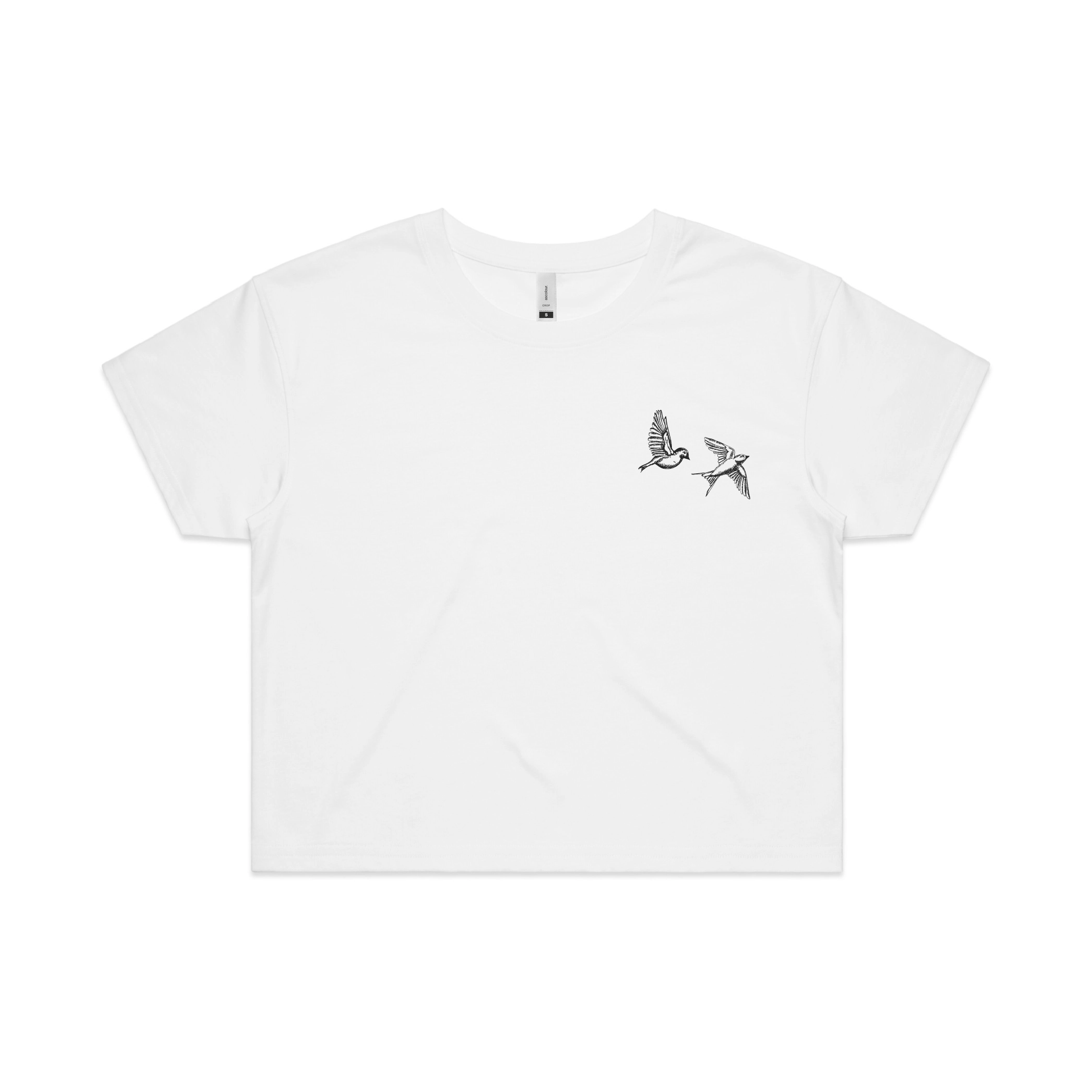 Our simple birds logo screen-printed on a 100% cotton cropped tee. This shirt is perfect for layering underneath our bomber jackets or styling with a bandana tied around your neck.