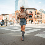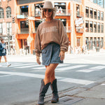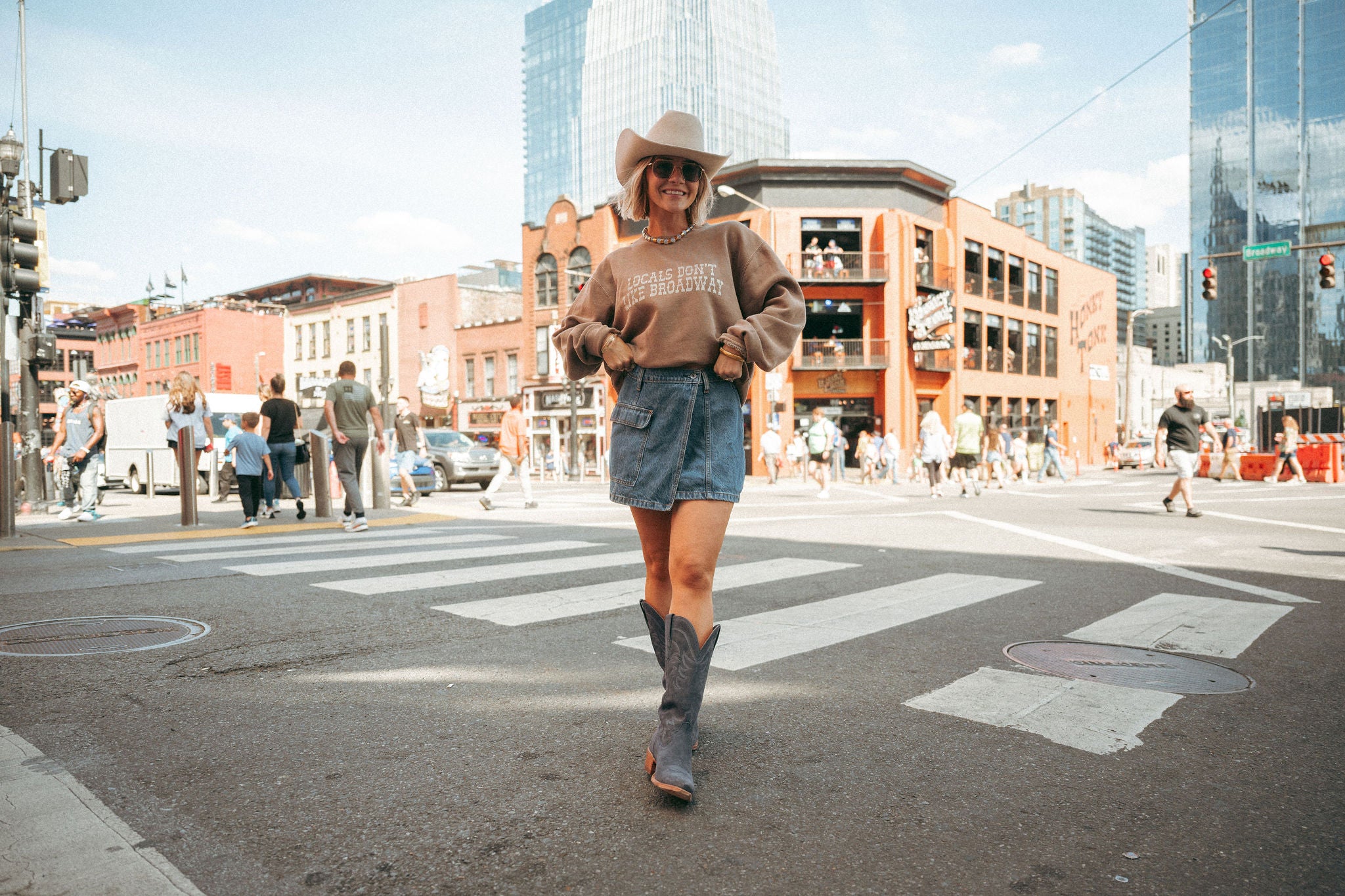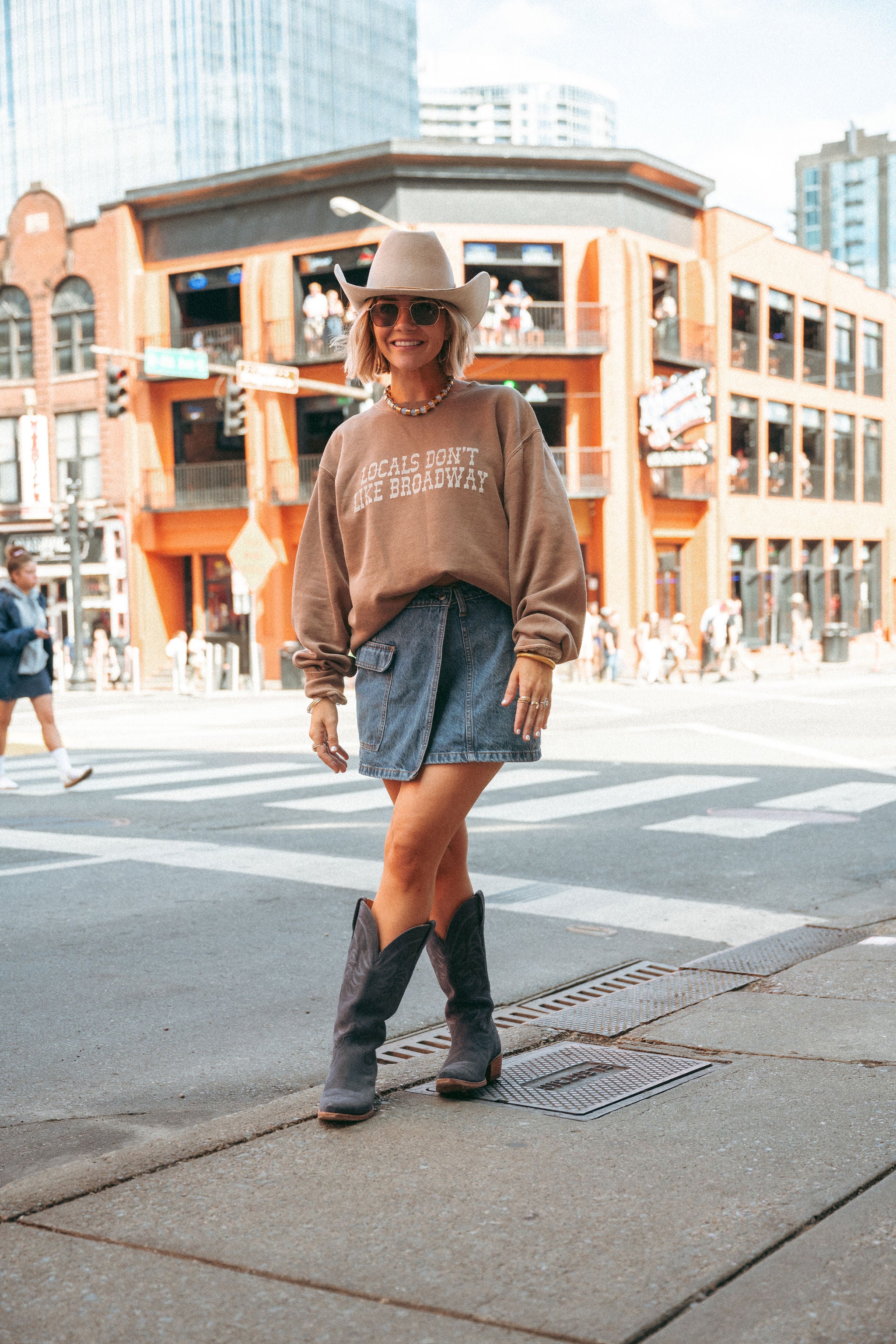 Drawing inspiration from beloved designs but refreshed with new styles. Meet the Locals Don't Like Broadway Crewneck in clay featuring puff screen printing. Crafted with quality yet lightweight material and a classic fit, each sweatshirt is screen printed right here in Nashville.