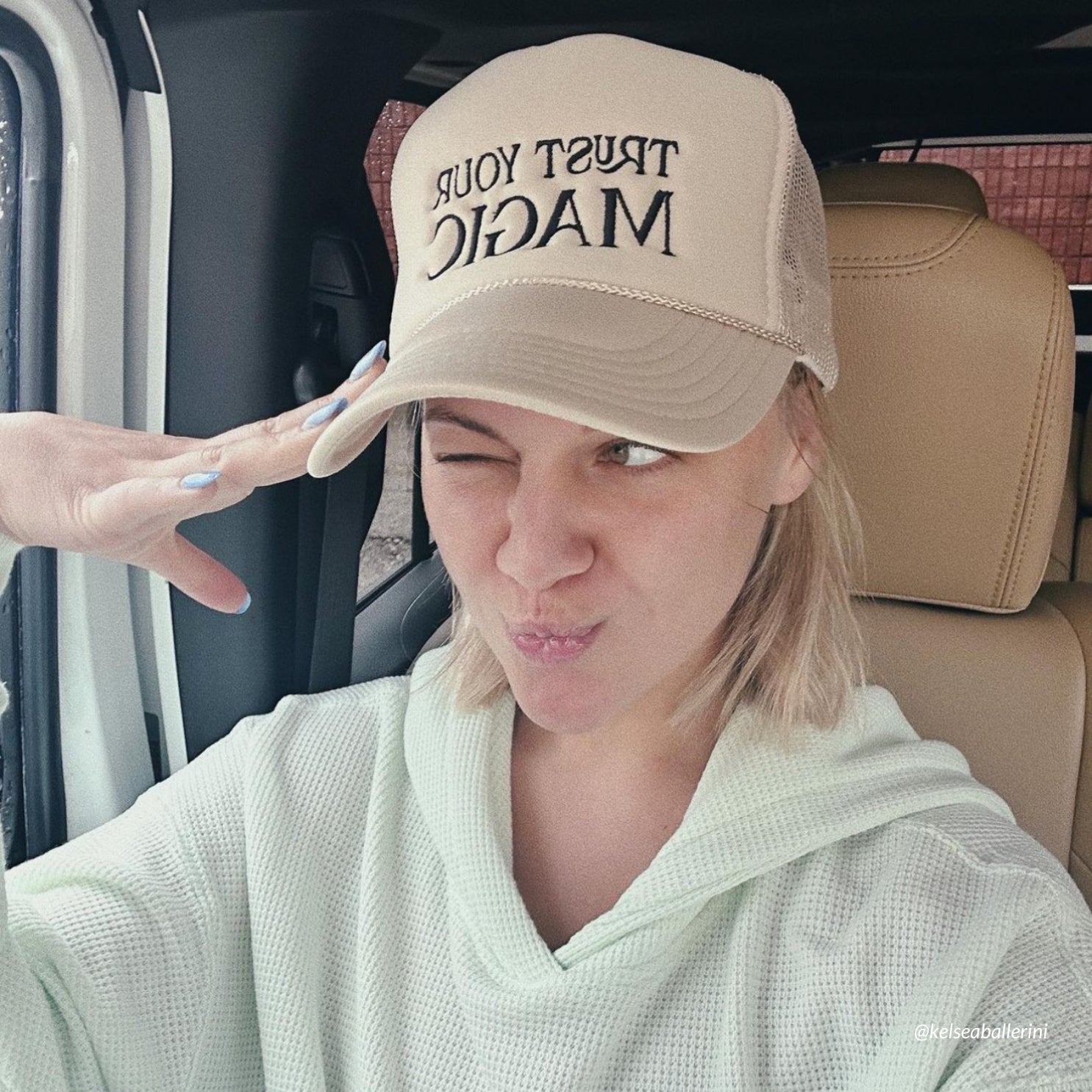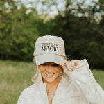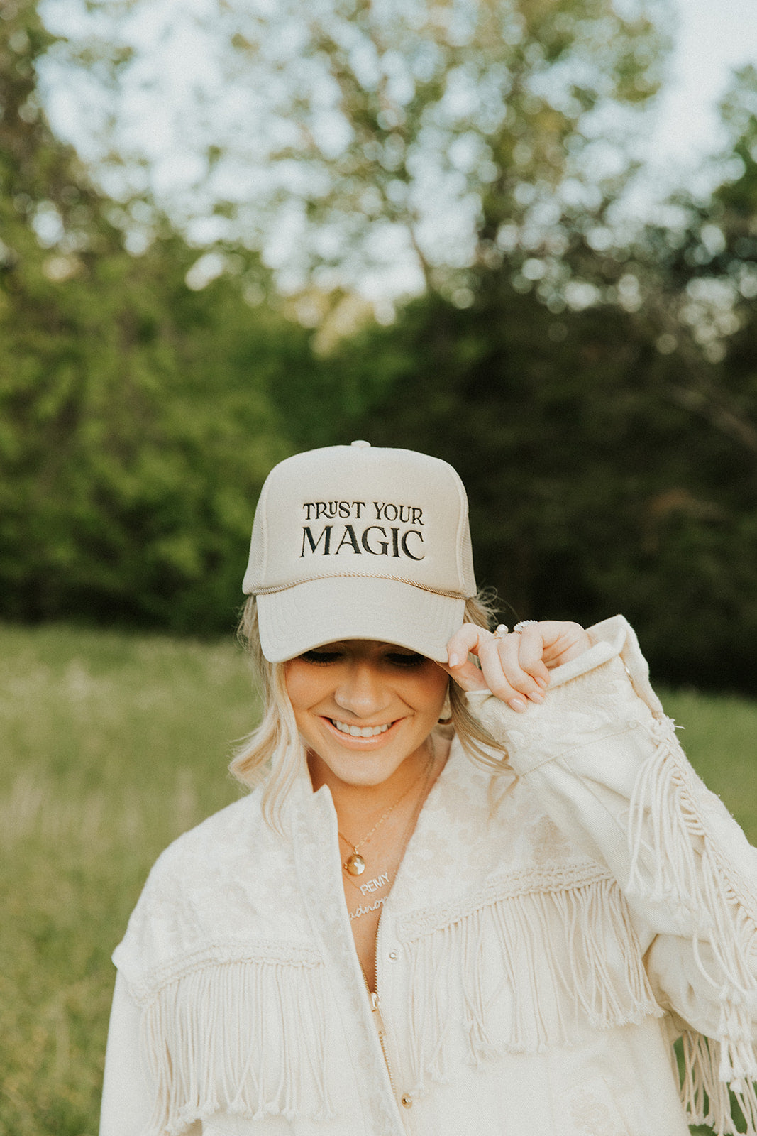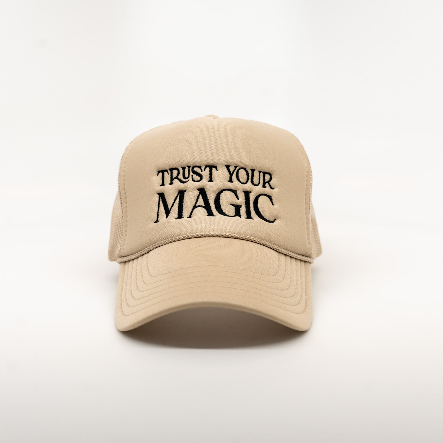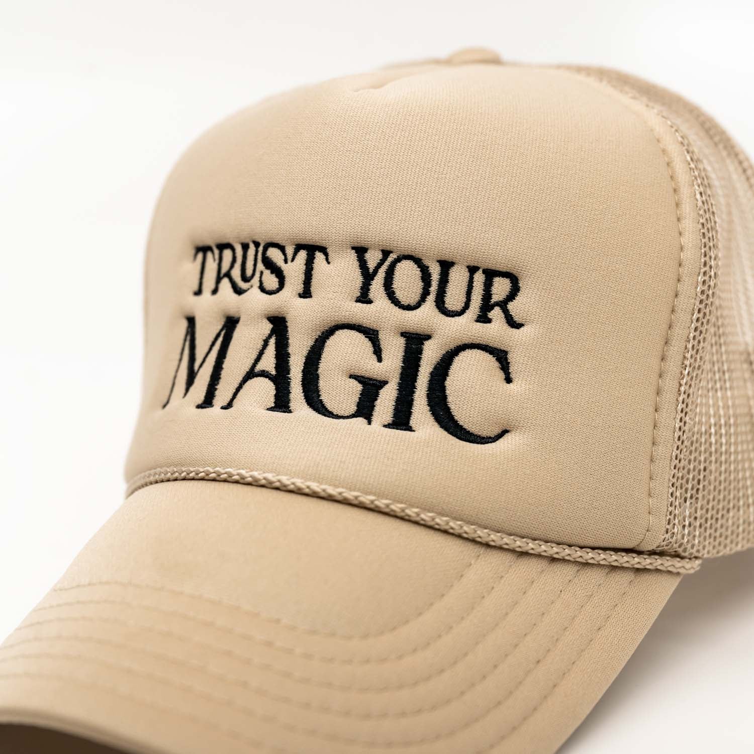 The hat itself is made from high-quality materials, featuring a classic foam trucker-style design with a mesh back for breathability and a snapback closure for an adjustable fit. The front of the hat is embroidered with the words "Trust Your Magic" in bold, eye-catching letters, making it the perfect accessory for any casual outfit.