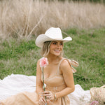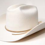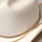 A Modern Cowboy Style in a bright ivory color. Our hats are designed in Nashville and handmade in a small factory in Portugal. Each one is created with high-quality goods using low-impact materials. Made from Premium wool, this hat is made to last.