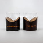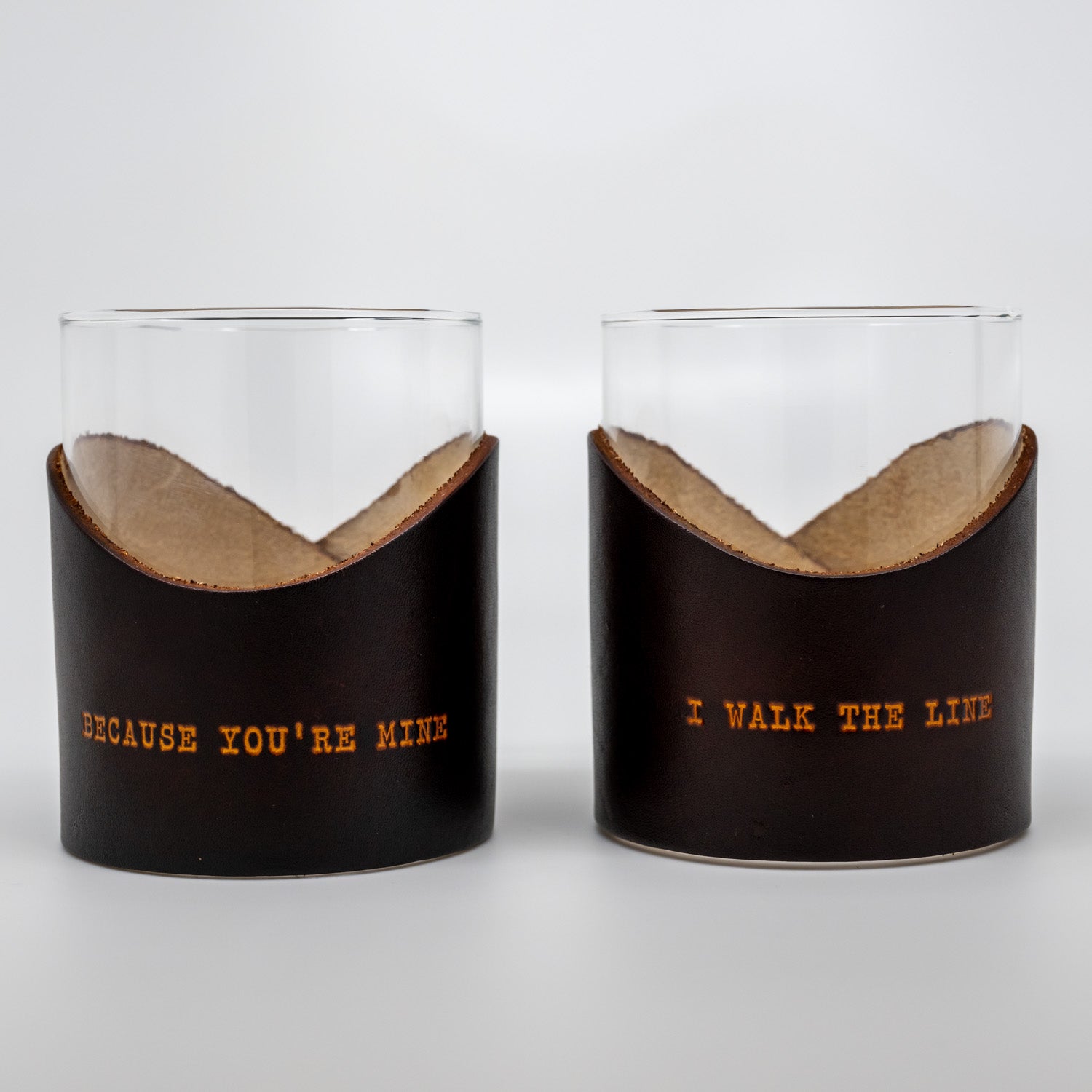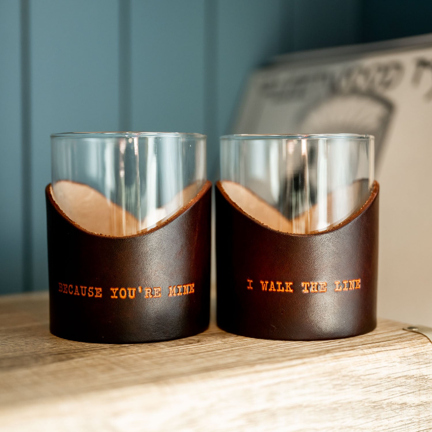 Handcrafted with genuine leather, this 12oz lowball glass is perfect for a drink by the fire with your favorite person. These glasses make the act of pouring a drink a little more special and also make the perfect gift. The leather wraps slide off the bottom for easy washing.