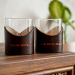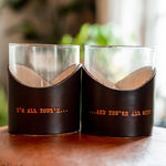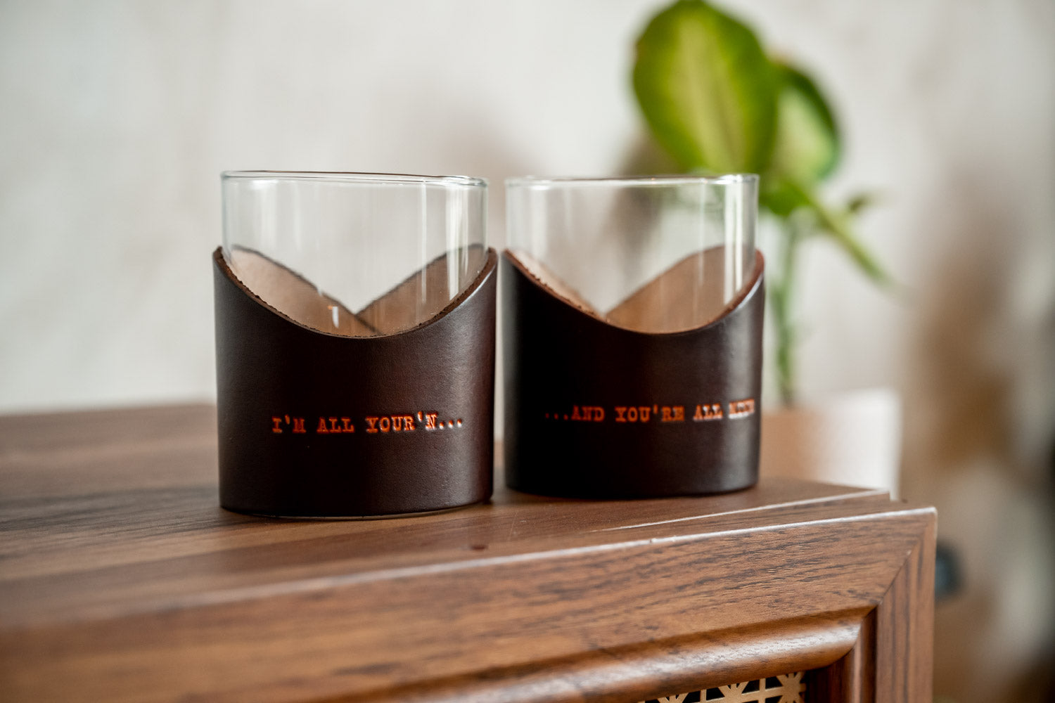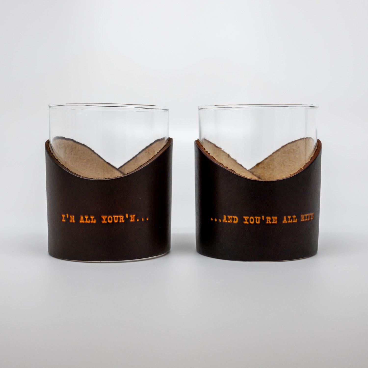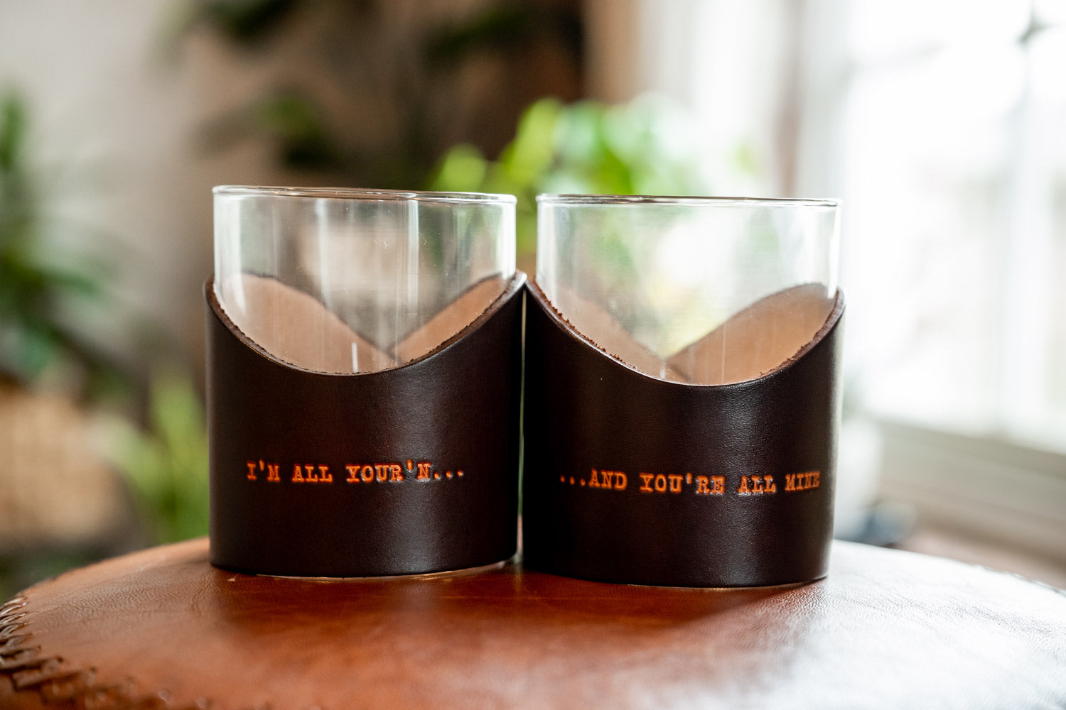 Handcrafted with genuine leather, this 12oz lowball glass is perfect for a drink by the fire with your favorite person. These glasses make the act of pouring a drink a little more special and also make the perfect gift. The leather wraps slide off the bottom for easy washing.